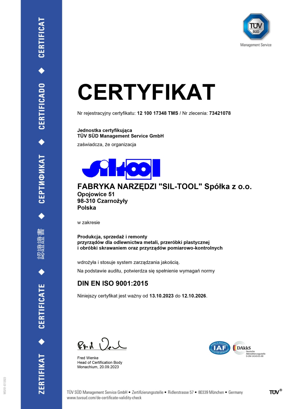 Certyfikat ISO 9001 - Fabryka Narzędzi SIL-TOOL